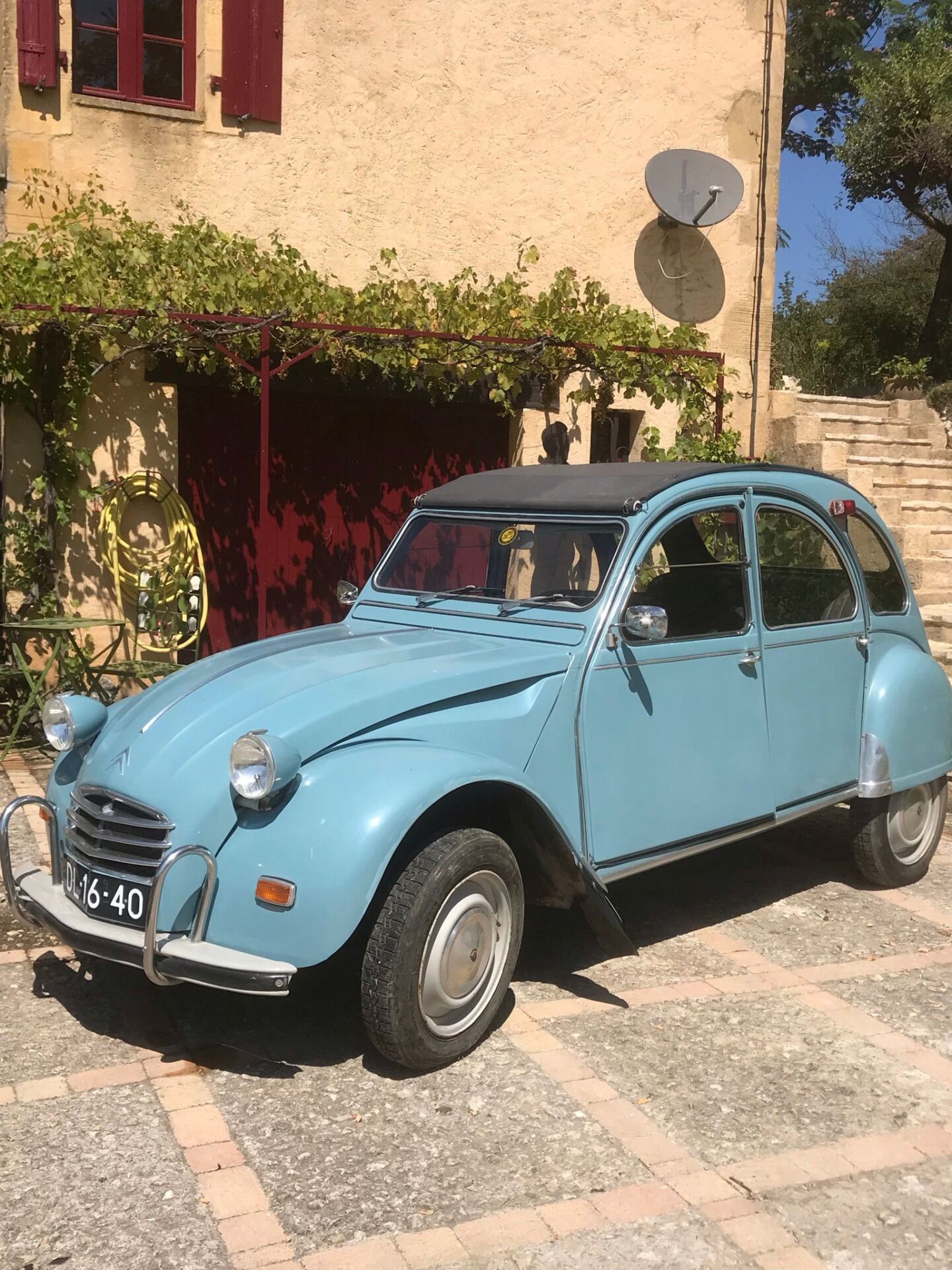 De 2cv staat in de Dordogne in Frankrijk; een leuke vakantie stop!