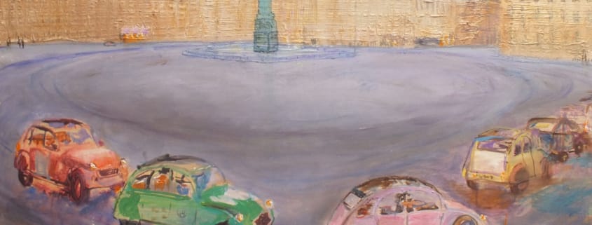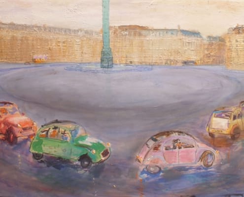 Te koop: olieverfschilderij met als onderwerp een groepje 2 CV’s dat een rit maakt over de Place de la Concorde in Parijs. Het schilderij meet 90 x 60 cm. De prijs die gevraagd wordt, bedraagt € 575.