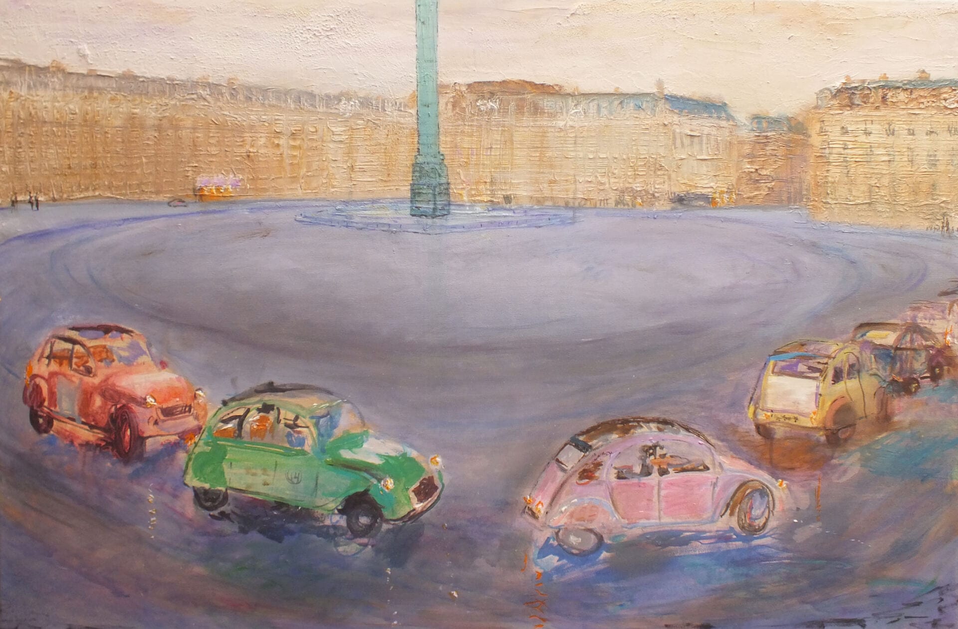 Te koop: olieverfschilderij met als onderwerp een groepje 2 CV’s dat een rit maakt over de Place de la Concorde in Parijs. Het schilderij meet 90 x 60 cm. De prijs die gevraagd wordt, bedraagt € 575.